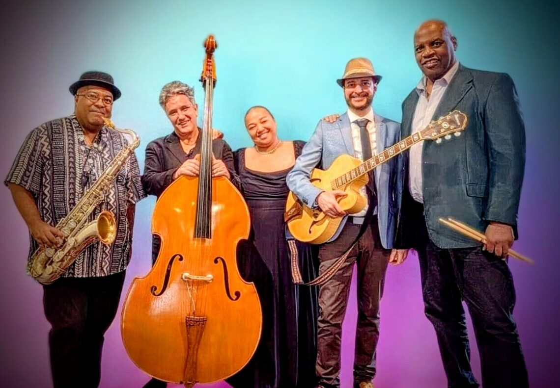 Quintet jazz avec chanteuse, saxophoniste, guitariste, contrebassiste et batteur